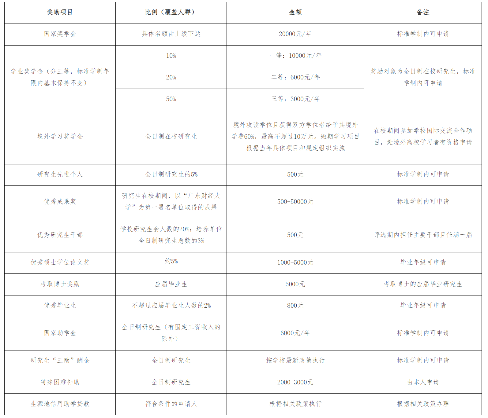 为完善研究生教育保障和激励机制,调动研究生参与科学研究和创新实践积极性,学校设立多种奖助学金。奖助体系见下表。